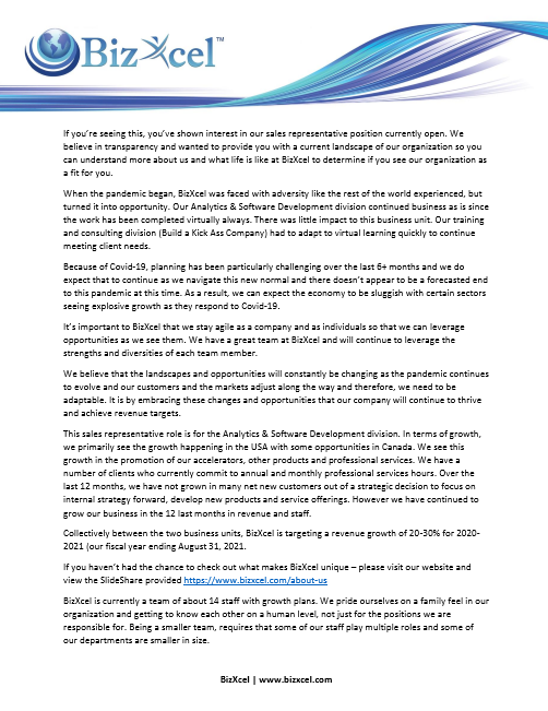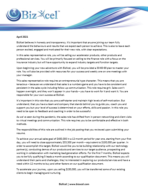 As part of our hiring process, BizXcel™ wanted to provide further insight into the sales representative role expectations and the current landscape at BizXcel™ so you can also evaluate to see if we are a good fit for you.